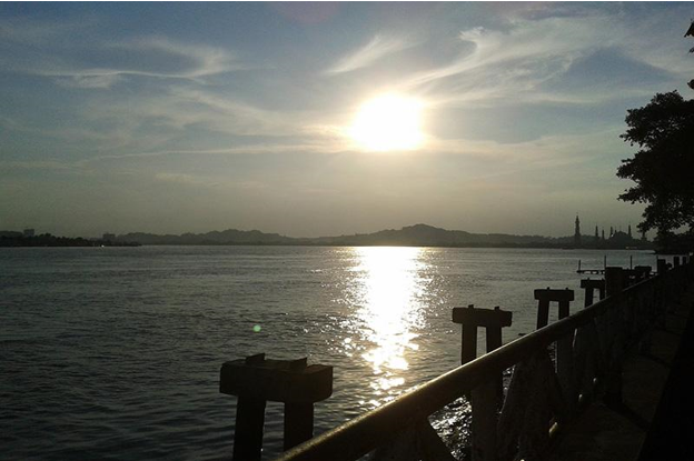 matahari yang berangsur menghilang ke arah barat di atas sungai memendarkan